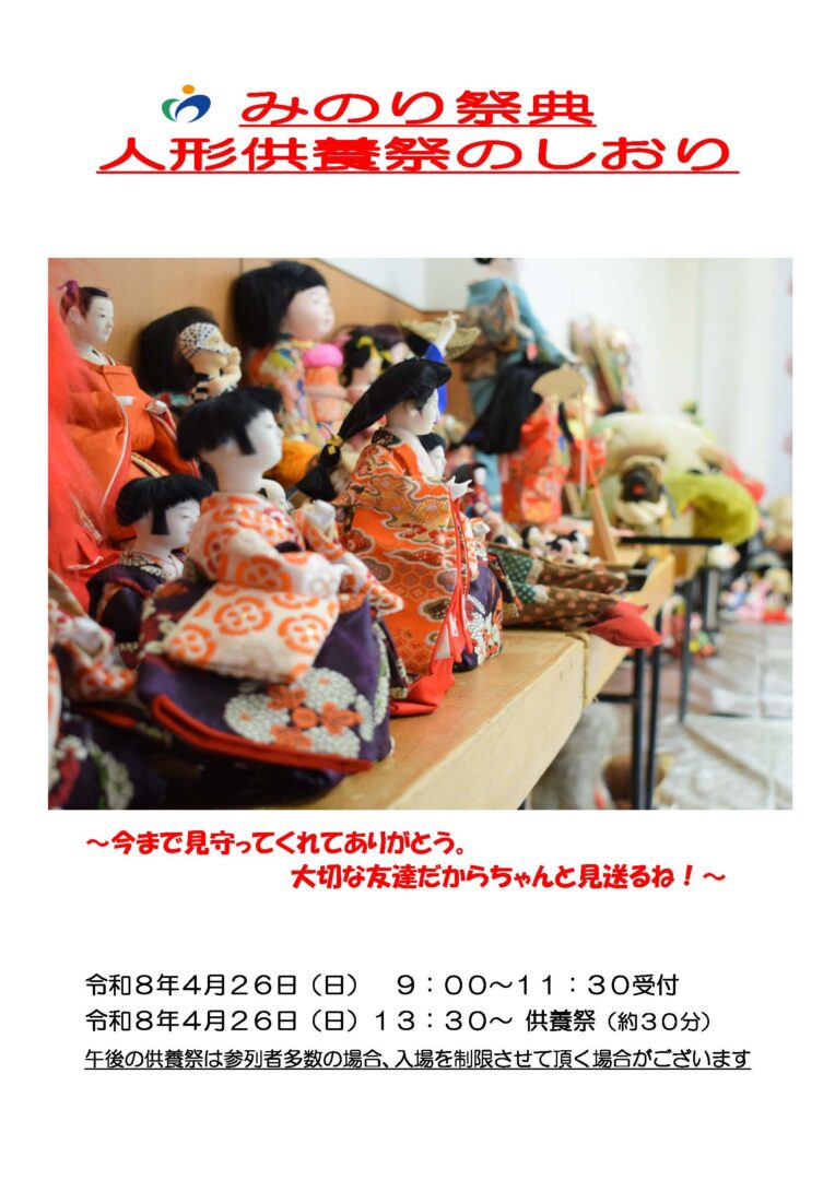 2026年2月21日 【令和8年4月26日(日)】人形供養祭開催のお知らせ みのり祭典では、令和8年4月26日(日)に、人形供養祭を開催いたします。皆さまの大切にされていたお人形や、ぬいぐるみを9:00~11:30まで受付させていただき、加東市の佐保神社宮司様に丁寧に御供養をして頂きます。